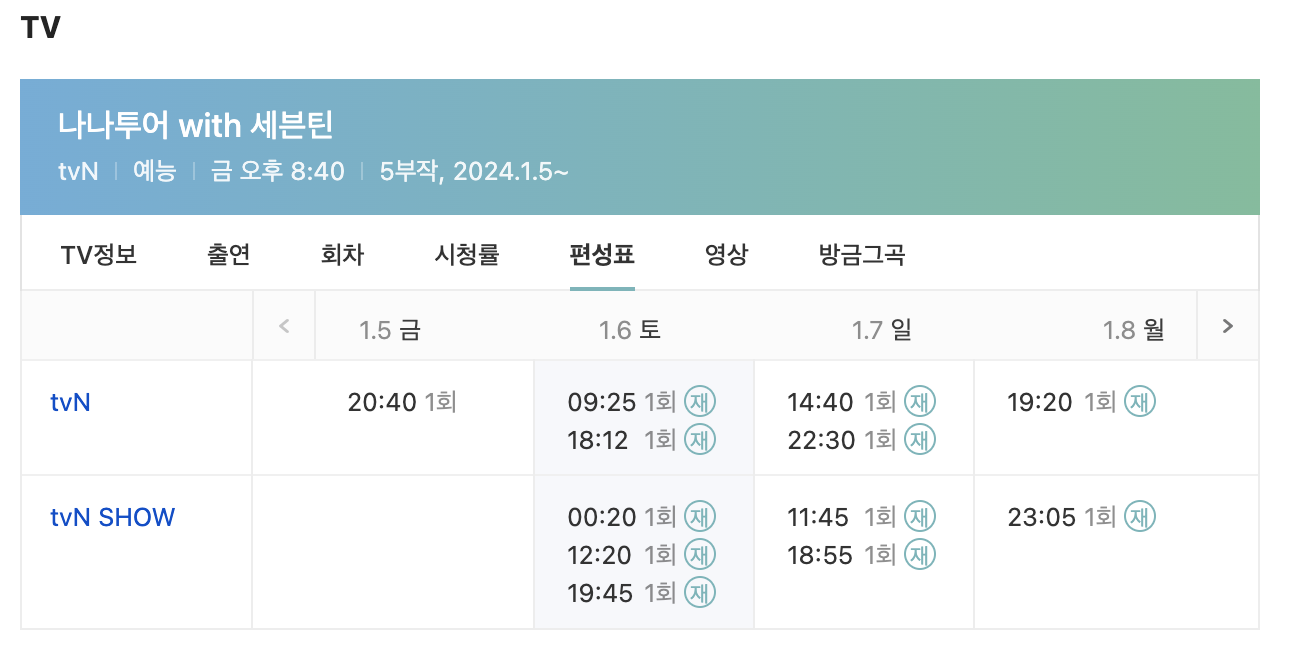 24년 1월5일 금요일 저녁 8시40분 첫방송으로 tvn 새로운 예능 나나투어 with 세븐틴이 시작했습니다.